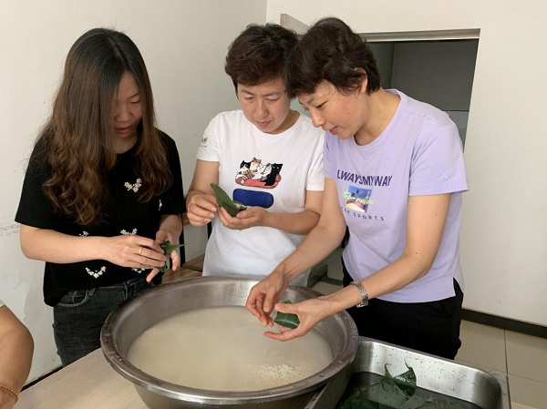 上午9點(diǎn),粽葉、糯米、大棗整齊地?cái)[上桌。大家邊包邊聊,其樂融融。在包粽子現(xiàn)場(chǎng),熟悉包粽子的能手們飛快地拿起粽葉,兩手一窩卷成漏斗狀,填米、加棗、壓緊、扎繩,一氣呵成。她們還充當(dāng)起“老師”的角色,教“新手”職工包粽子,手把手現(xiàn)場(chǎng)教學(xué),“老師”教得仔細(xì),“學(xué)生”學(xué)得認(rèn)真,但要做出餡料十足、外觀漂亮的粽子還是需要費(fèi)一番功夫的。隨著技巧的不斷嫻熟,一個(gè)多小時(shí)的時(shí)間,形狀各異、大小不一的一百多個(gè)粽子就堆積成山了,預(yù)算科副科長(zhǎng)竇夢(mèng)娜說(shuō):“我們包粽子的水平真是越來(lái)越高了,明年再包會(huì)更好!”此時(shí)每個(gè)人心里都洋溢著一股喜悅之情,有初學(xué)一門手藝的欣喜,有參與集體活動(dòng)交流感情的滿足。