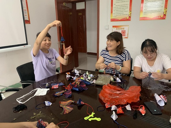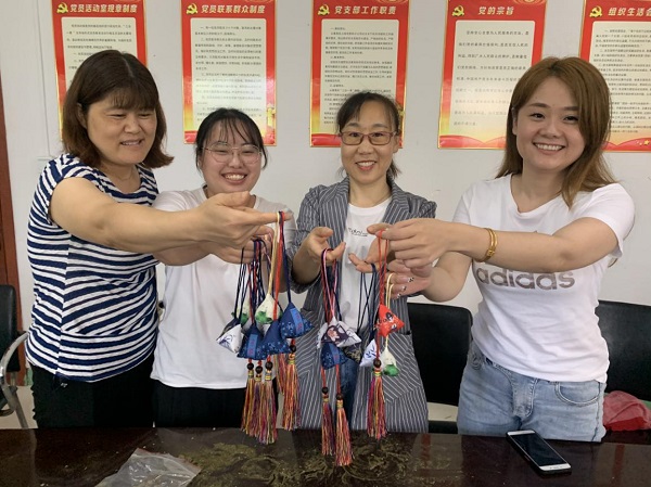 在傳統(tǒng)習(xí)俗中,玲瓏可愛的各色香包也是端午節(jié)必不可少的元素。包完粽子后大家轉(zhuǎn)移陣地到了活動(dòng)室,大家圍坐桌邊,面前堆放著一份份材料包,有棉布、艾草、針線、中國(guó)結(jié)流蘇。面對(duì)這個(gè)從來(lái)沒有做過的DIY,大家開始研究起來(lái),有的用手機(jī)搜索縫制方法流程,有的直接比來(lái)比去親自摸索著縫起來(lái)。有職工說(shuō):“這有點(diǎn)像咱們小時(shí)候老人們縫的毽子,那個(gè)里面裝的是五谷雜糧,咱們現(xiàn)在裝的是艾草?!薄斑@香囊可以掛在辦公室或者車上,有清香、驅(qū)蚊的功效?!薄拔宜闶侵懒?,這個(gè)流蘇應(yīng)該縫在這個(gè)邊的中間,而不是角上……”大家你一句我一句,手中的針線穿梭在棉布間,用密密的針腳縫制出傳統(tǒng)佳節(jié)最好的注解,用絲絲線線纏繞出端午安康的美滿寓意,一個(gè)個(gè)精巧可愛的三角香囊在大家的努力下完美呈現(xiàn)。