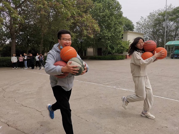 “誰先來?抱球游戲升級——1人抱4個籃球向前奔跑,過程中一個球也不得落地,否則成績無效?!辈门兄坏膶徲嬁崎L談增迫不及待地宣布?!皞€子高的胳膊、腿長,有優(yōu)勢,先上。”人群里有人提議,工程科身高一米八的帥小伙劉文浩和綜合辦高個子王春影舉手示意,跑道上呈現(xiàn)二人灑脫、漂亮的抱球姿勢。