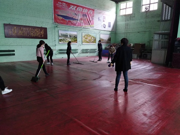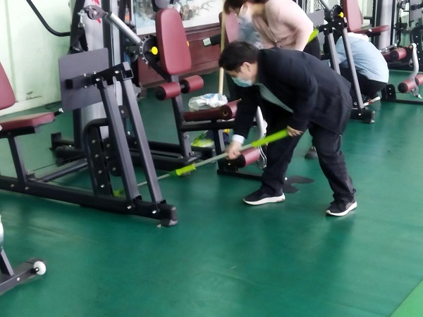 參與活動(dòng)的20余名同志,分工合作,雖然大家來(lái)自不同部門、不同崗位,但爭(zhēng)先恐后、合作默契,清理地面、擦拭健身器材、清潔桌凳?!扒懊娴哪型緜兗佑土?,我們快趕上你們了!”負(fù)責(zé)拖地的九分公司主任經(jīng)濟(jì)師劉彩在后面說(shuō)道?!斑@個(gè)乒乓球擋布拿抹布擦拭的效果不太好,用外面的高壓水槍沖洗試試吧!”九分公司主任會(huì)計(jì)師付世芳一邊用抹布擦拭擋布一邊提出自己的合理化建議,“這個(gè)辦法好!”九分公司綜合辦公室主任張路平同意道。
