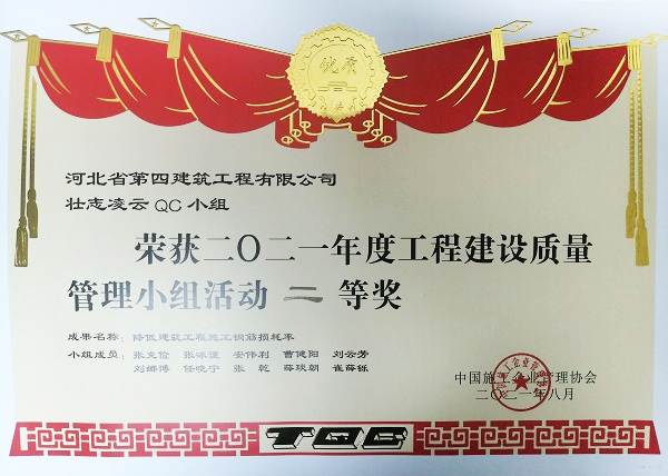 10月中旬,公司收到中國施工企業(yè)管理協(xié)會《關于公布2021年工程建設優(yōu)秀質(zhì)量管理小組的通知》,在中國施工企業(yè)管理協(xié)會工程建設質(zhì)量管理競賽中,七分公司壯志凌云QC小組經(jīng)過初賽、復賽、決賽三個階段比拼,最終榮獲二等獎。