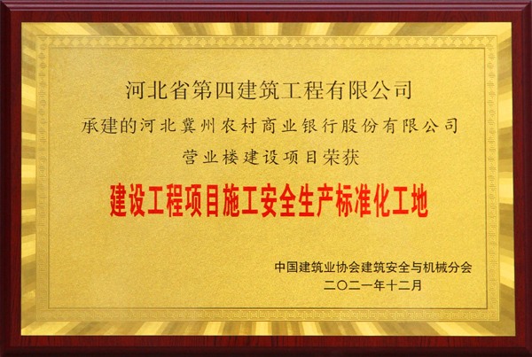2021年12月22日,公司收到中國建筑業(yè)協(xié)會安全與機(jī)械分會下發(fā)的文件,我公司施工的河北冀州農(nóng)村商業(yè)銀行股份有限公司營業(yè)樓建設(shè)項目喜獲全國安全生產(chǎn)標(biāo)準(zhǔn)化工地,這是公司第9次獲得此項榮譽。