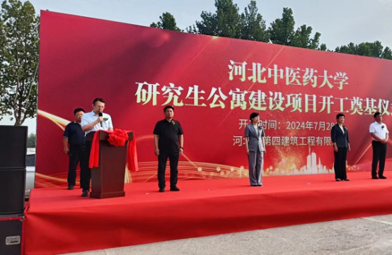 奠基儀式現(xiàn)場(chǎng),挖掘機(jī)、裝載機(jī)身披大紅花整齊排列,猶如即將出征的戰(zhàn)士,工人整裝待發(fā),信心滿滿、斗志昂揚(yáng)。儀式在歡快激昂的樂曲聲中拉開序幕。主持人首先介紹了參加本次儀式的相關(guān)領(lǐng)導(dǎo)和項(xiàng)目概況。隨后,唐志強(qiáng)作為施工單位代表首先發(fā)言,“我公司有幸承接該施工任務(wù),充分體現(xiàn)了項(xiàng)目主管部門和建設(shè)單位對(duì)我們國(guó)有建筑企業(yè)的信任和支持。河北四建一定高標(biāo)準(zhǔn)、嚴(yán)要求,為項(xiàng)目順利實(shí)施提供有力保證,為業(yè)主提供滿意服務(wù),為河北中醫(yī)藥大學(xué)醫(yī)學(xué)教育的高質(zhì)量發(fā)展貢獻(xiàn)力量!”最后,學(xué)校黨委副書記孫士江表示,河北中醫(yī)藥大學(xué)研究生公寓為省政府支持骨干大學(xué)建設(shè)項(xiàng)目,希望參建各方全力以赴確保按時(shí)完工投入使用,建設(shè)“品質(zhì)工程”“一流工程”,促進(jìn)學(xué)校各項(xiàng)事業(yè)取得新成就,為經(jīng)濟(jì)強(qiáng)省、美麗河北建設(shè)作出新的更大貢獻(xiàn)!