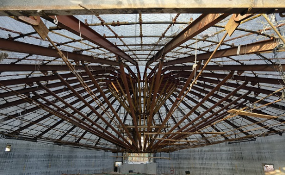體系設計優(yōu)化,拼裝提速。“鋼筋混凝土筒倉錐殼頂板架空支撐施工工法”依托糧食類筒倉工程,筒倉建筑高度高達50米,內(nèi)徑26米,倉頂設計為錐殼頂、平頂雙層結(jié)構,斜錐殼板厚0.2米。以往筒倉倉壁一般采用滑模施工,錐殼頂板施工復雜,一般采用H型鋼組裝成圓柱形核心筒、外輻射鋼桁架平梁的方式組裝成支撐平臺,重21.9噸,用鋼量大,制作成本高;節(jié)點連接采用焊接,拼裝速度慢,無法滿足群體筒倉的周轉(zhuǎn)時效。分公司針對傳統(tǒng)做法的弊端,組織科研小組,專項研究,破解難題,最終形成了空間鋼桁架——拉索組合結(jié)構支撐體系。該體系摒棄了3.2米直徑的圓柱型核心筒,采用直徑2.6米的傘狀中心筒,通過五道環(huán)梁環(huán)向拉接,無需設置斜撐,原結(jié)構減輕將近1噸,節(jié)約了制作成本,而且承壓能力更強。重點節(jié)點還改用了高強螺栓連接代替焊接,拼裝速度明顯提升,施工速度更快。