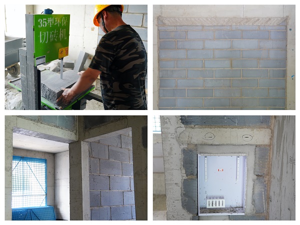 在材料利用與成本控制方面,項目團隊探索出了“更優(yōu)解”。針對頂部斜砌施工,項目部原計劃采購混凝土預制塊進行砌筑,但在論證中發(fā)現(xiàn)采購的預制塊存在成本高、運輸損耗大、工序銜接慢等弊端。經過反復研討,項目團隊決定就地取材,利用現(xiàn)場加氣混凝土砌塊施工剩余的裁切廢料,通過定型化切割模具進行精準切割,替代外購預制塊。為保障方案順利實施,項目部提前抽調技術嫻熟的切割工,組織加氣塊切割專項培訓,同時提前安裝調試好40余臺高精度切割設備,現(xiàn)場切割作業(yè)得以高效展開。這一創(chuàng)新方法的運用,將加氣塊材料的現(xiàn)場利用率提高到90%以上,其切割面更加平整,有效保障了斜砌質量和結構整體性,提升了觀感效果。