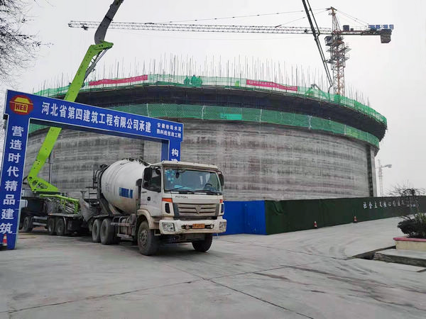 熟料儲存及輸送筒倉直徑60米,高20.5米。1月11日,業(yè)主項目負責人王利杰組織召開專題會議,鄭重要求1月20日前滑模施工必須完成。面對業(yè)主早日投產(chǎn)的殷切期盼,項目部緊急組織施工策劃,明確搶進度措施辦法,全體動員,多點發(fā)力,全力以赴?;J┕?。在動員會上,成立了以項目經(jīng)理為組長的滑模領(lǐng)導小組,班子帶班,明確責任目標;與作業(yè)班組簽訂安全、質(zhì)量承諾書,增強其責任意識;購置鋼筋間距測量設(shè)備,節(jié)省驗收鋼筋工程時間和人力。由于疫情原因,現(xiàn)場勞力不能迅速到位,項目部提前組織管理人員晚上加班吊運鋼筋、水泥、腳手板等材料,大家高漲的干勁兒在滑?,F(xiàn)場起到了積極的帶動作用。庫壁預應力鋼絞線設(shè)置較為密集,每間隔26厘米一道,而且?guī)в腥嵝?,往庫壁鋼筋?nèi)穿設(shè)時容易跑偏,工作效率低。為加快施工,技術(shù)人員巧妙地在庫壁鋼筋上加設(shè)了U型鋼筋固定鋼絞線穿行位置,然后大家一字排開,“一二、一二……”齊聲喊著口號,有節(jié)奏地用力將鋼絞線在庫壁鋼筋里穿行直到扶壁柱。數(shù)九隆冬的夜間滑模平臺上氣溫很低,但是大家的工作熱情不減,干勁不退,抬鋼筋、綁鋼筋、穿鋼絞線……,干得熱火朝天,沒有人叫苦喊累,在大家的共同努力下,滑模以每天2.7米的速度快速推進。