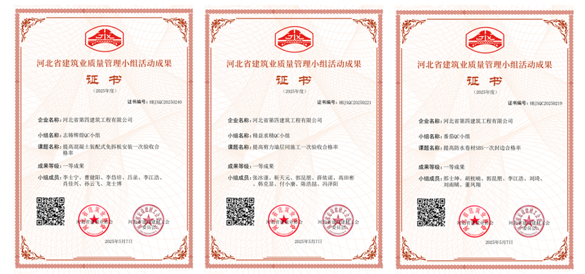 5月15日,七分公司申報的“提高防水卷材SBS一次封邊合格率”“提高剪力墻層間施工一次驗(yàn)收合格率”“提高混凝土裝配式免拆板安裝一次驗(yàn)收合格率”三項(xiàng)QC成果,被河北省建筑業(yè)協(xié)會評為“一等成果”。這不僅是河北省建筑業(yè)協(xié)會對分公司技術(shù)創(chuàng)新能力的高度認(rèn)可,更是分公司扎實(shí)開展QC小組活動、有效攻克施工難題、提升項(xiàng)目施工質(zhì)量的生動寫照。