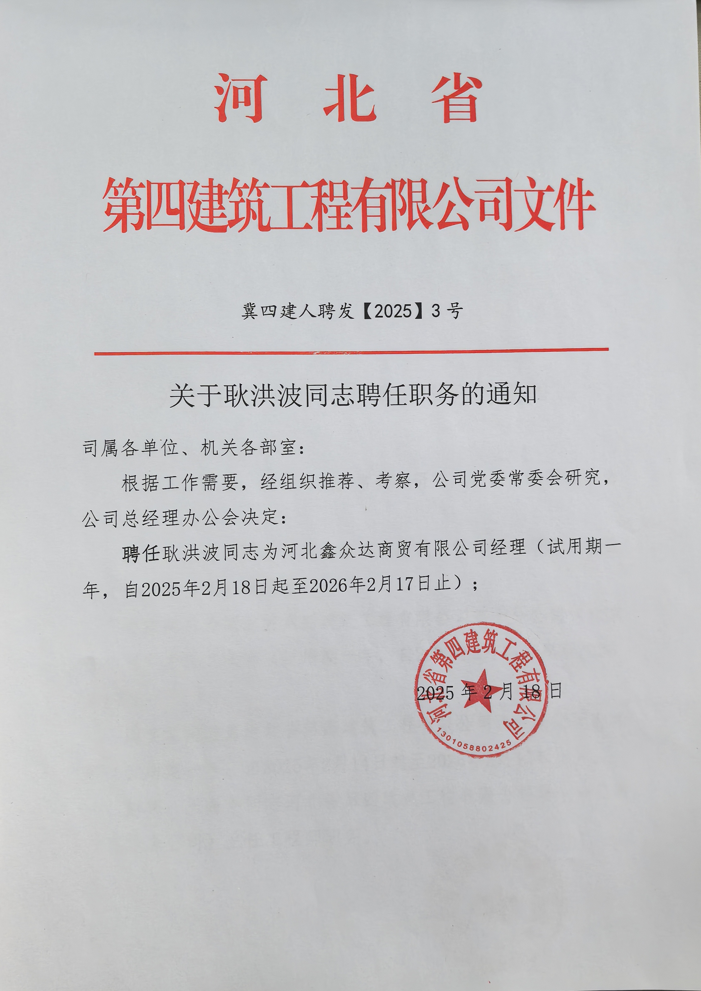 關(guān)于耿洪波同志聘任職務(wù)的通知